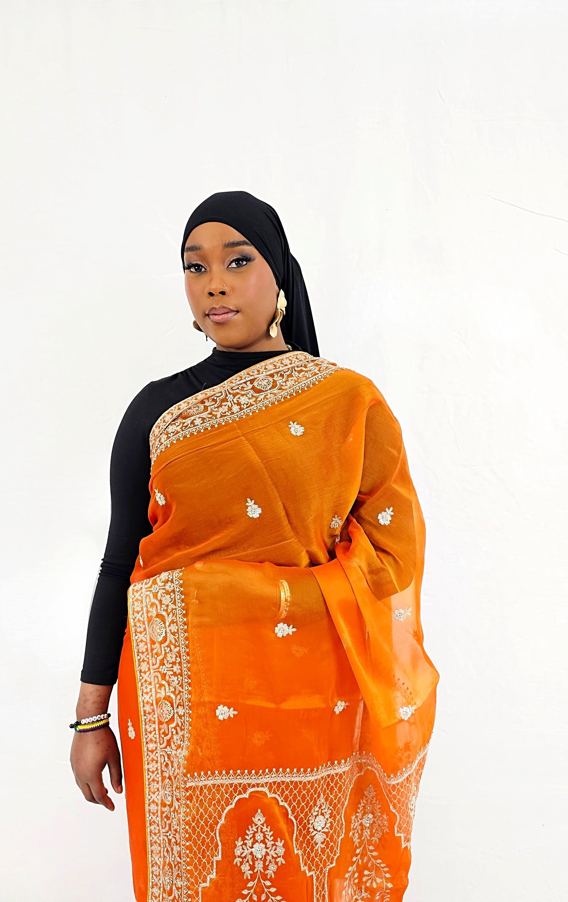 Tissu fantaisie premium, sublimé par un travail de broderie designer, agrémenté de perles, moti, sequins, perles nacrées et broderies raffinées, offrant une finition élégante et luxueuse.