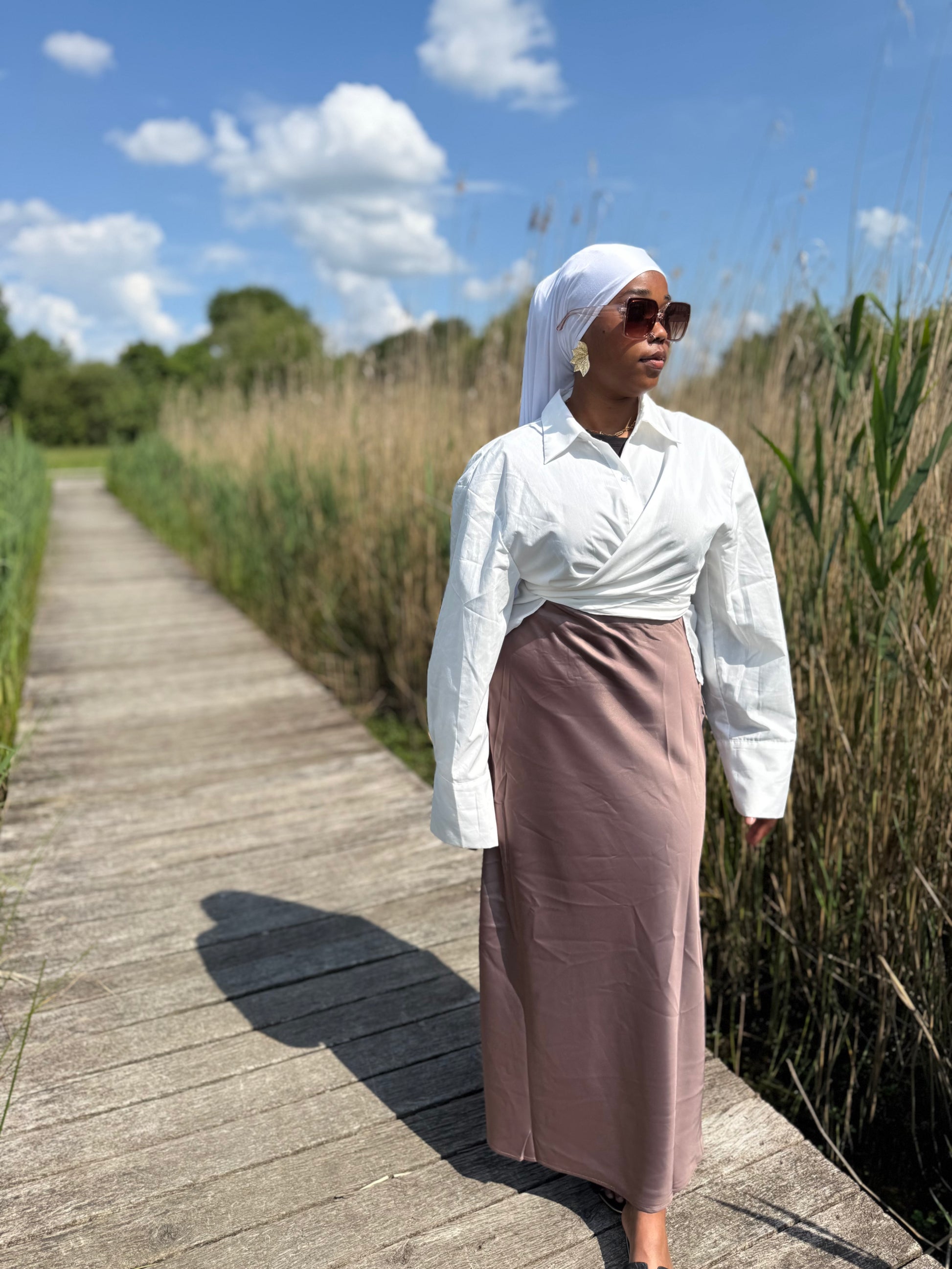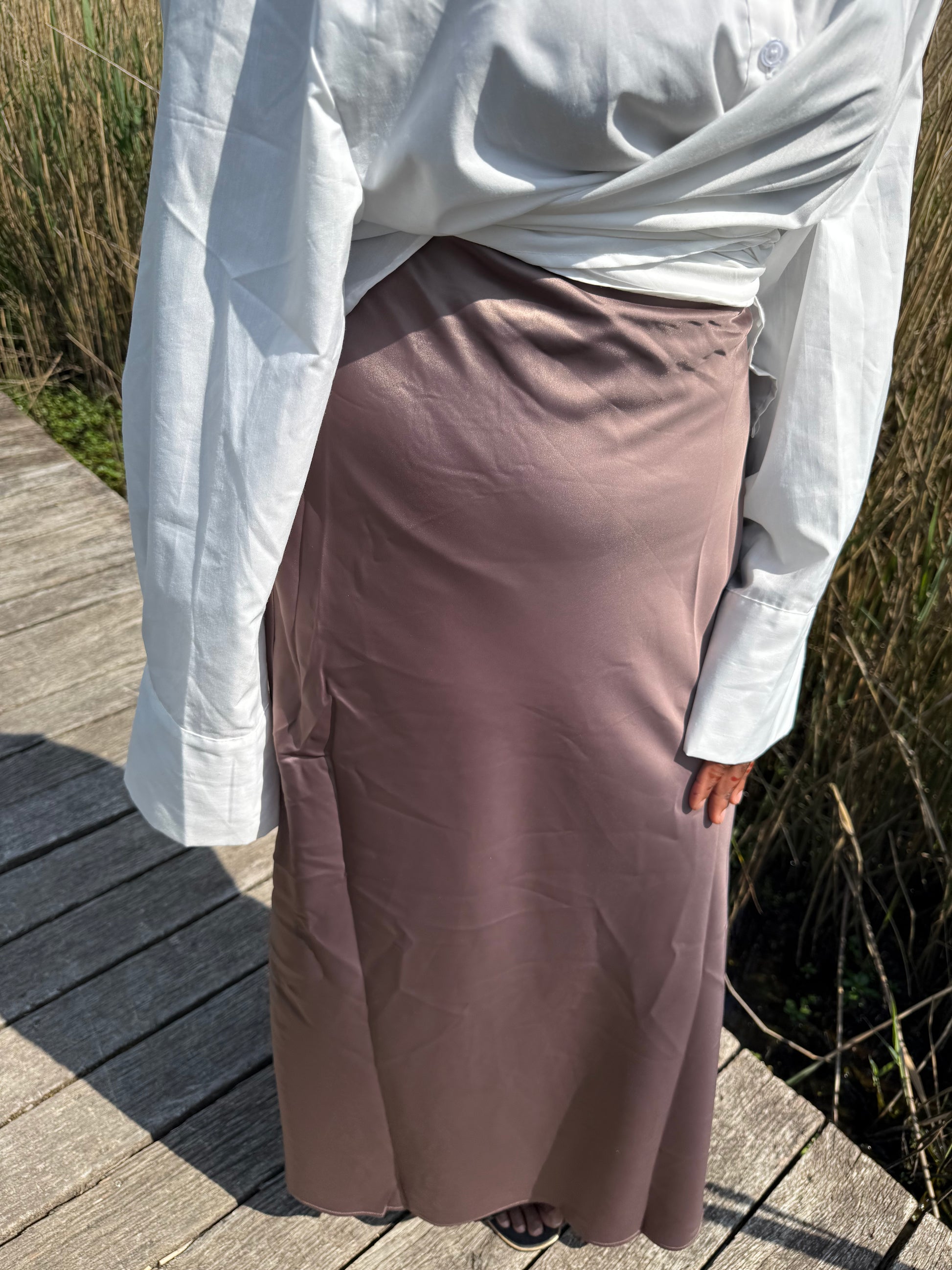 Jupe longue en polyester brillant, élastique à la taille et fermeture côté. Coupe légèrement évasée.